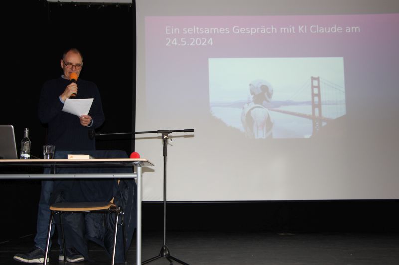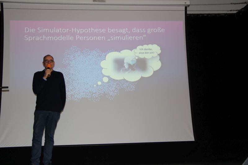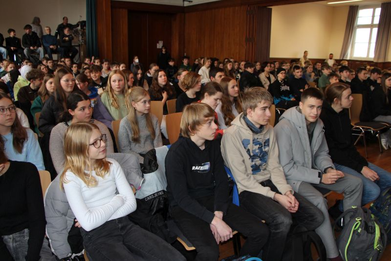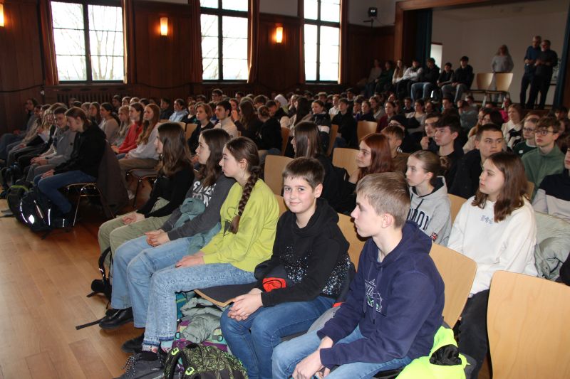 Karl Olsberg promovierte über künstliche Intelligenz und erläuterte den Schülerinnen und Schülern der Jahrgangsstufen 8 bis 10 einen kurzen Abriss über die sehr schnelle Entwicklung der KI und warf auch viele philosophische Fragen auf, die die Jugendlichen zum Nachdenken anregten. Kann eine KI ein Bewusstsein entwickeln? Worin unterscheidet sie sich noch von einem Menschen? Und worin besteht die menschliche Kontrolle über Technik? Ein Schwerpunkt lag auch darauf, Risiken einer zukünftigen hochentwickelten KI einschätzen zu können. Somit weckte die Lesung nicht nur literarisches Interesse, sondern gab auch den ein und anderen Denkanstoß, die Zukunft und Gegenwart in digitaler Zeit kritisch und aktiv mitzugestalten.