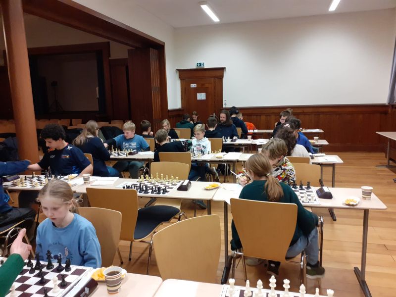 Nach einer kurzen Einführung in das richtige Turnierverhalten starteten 24 Schülerinnen und Schüler und sogar zwei Lehrkräfte in das Blitzturnier, das aus insgesamt fünf Runden mit einer jeweiligen Bedenkzeit von fünf Minuten bestand.