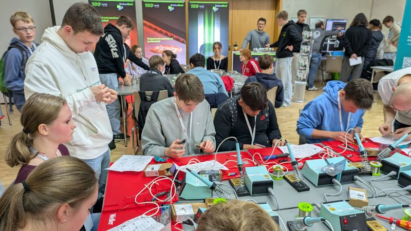 Zwischen den Stationen informierten sich die Jugendlichen an Infoständen über Studienmöglichkeiten, Ausbildungsgänge und Berufsperspektiven im MINT-Bereich.