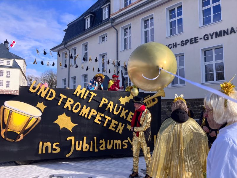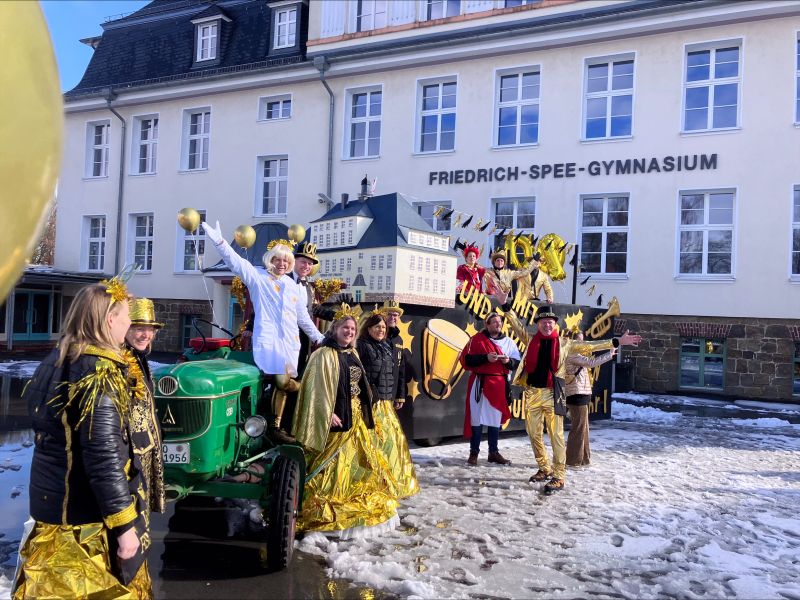 Das Friedrich-Spee-Gymnasium hat sein Jubiläumsjahr mit einem glänzenden Auftritt beim Rosenmontagsumzug der Stadt eröffnet: Unter dem Motto „Mit Pauke(r)n und Trompeten ins Jubiläumsjahr“ zog das Kollegium mit einem eigenen Karnevalswagen durch die Straßen — und wurde dafür mit begeistertem Applaus der Zuschauerinnen und Zuschauer belohnt.