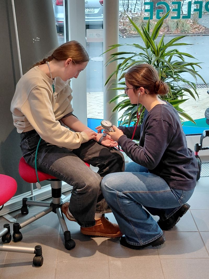 Im praktischen Teil setzten die Schülerinnen selbst Hand an: An einer Pflegepuppe übten sie die Versorgung chronischer Wunden und lernten den Umgang mit intelligenten Assistenzsystemen. Durch Gewichte am ganzen Körper konnten die Schülerinnen sich buchstäblich in die „Lage“ eines älteren Menschen versetzen und erleben, wie beschwerlich allein das Aufstehen für Menschen höheren Alters sein kann. Zuletzt erhielten sie einen Einblick in die digitale Pflegedokumentation, die im modernen Gesundheitswesen zunehmend an Bedeutung gewinnt.