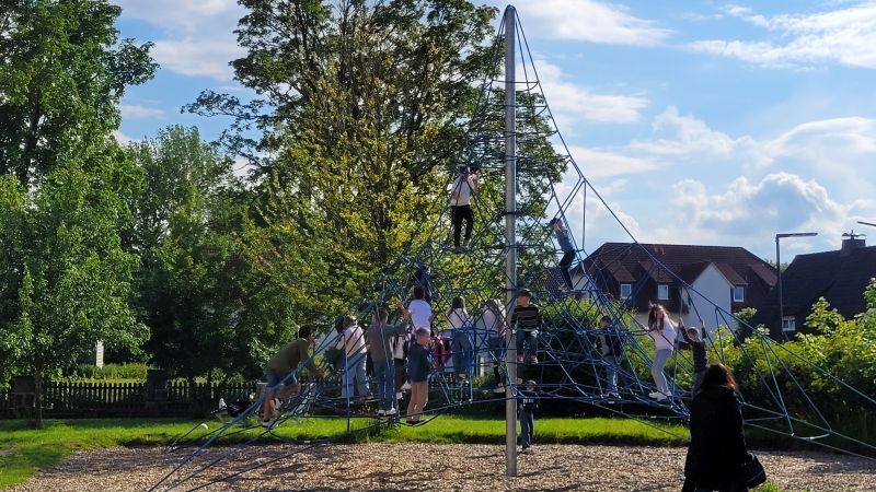 Die Gespräche mit den Eltern der neuen Klasse wurden auch noch fortgesetzt, als die Kinder zurückkamen und viele bei Sonnenschein die Kletterpyramide gemeinsam erklommen.