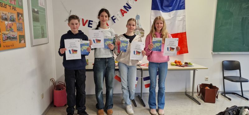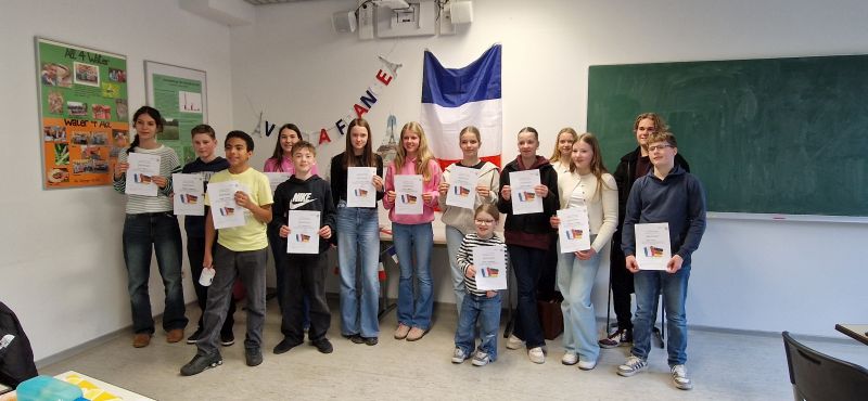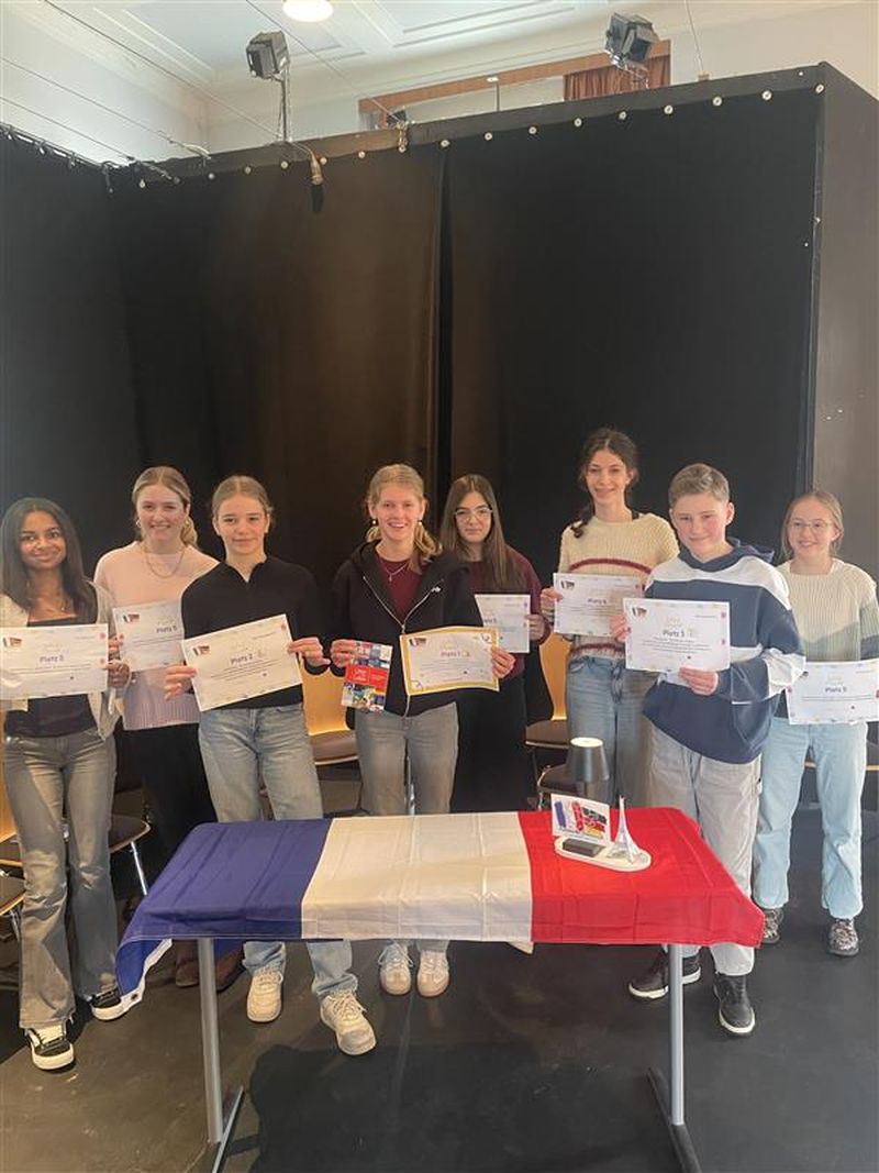 Im Schulentscheid starteten acht Schülerinnen und Schüler der beiden Französischkurse mit dem Vorlesen eines ihnen bekannten Textes, anschließend lasen sie einen unbekannten Text vor. Die Siegerin des schulinternen Wettbewerbs war Emily R. (8b). Nicole B. (8c), Helena A. (8d) und Lennet K. (8c) belegten die Plätze zwei bis drei. Alle Teilnehmenden freuten sich über eine Urkunde und Preise des Netzwerkes Französisch der Bezirksregierung Arnsberg.